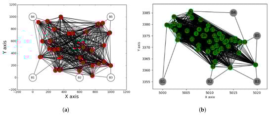 As shown in Figure 3a, the considered network consists of nodes randomly placed in an area of size 1 km and sinks are labelled in terms of the energy required to collect information from them. The coordinates of nodes in both networks are in metres and could be seen or approximated using Figure 3a,b. Positions (of sinks or base stations) consist of triples but for simplicity of plotting/viewing them, they have been projected on X-Y coordinates and hence, they are presented in the 2D Cartesian coordinate system.