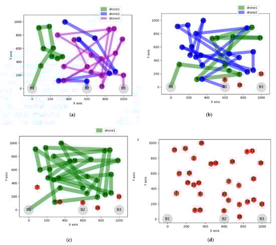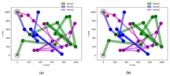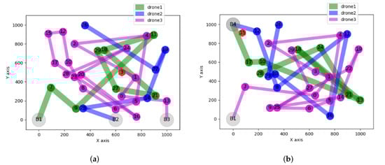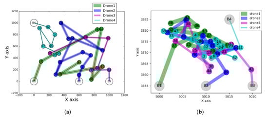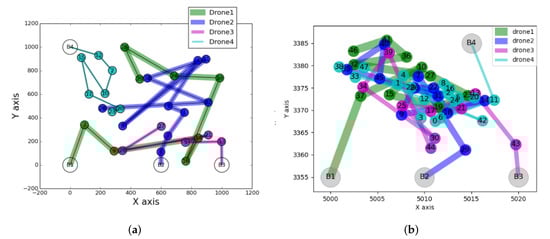 Table 3 shows that when the speeds are different, the delivery also requires some UAVs to pass by some of the already visited nodes in order to arrive at the closest base stations. Table 3a shows that Drone2 and Drone4 deliver the collected data at the same base station (B1), and Table 3b shows that Drone1 and Drone4 deliver the collected data at the same base station (B4).