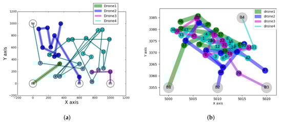 Figure 4. Path generation when the UAVs have the same speed. (a) Path generation on a random network; (b) Path generation on a real network. - Step 2.