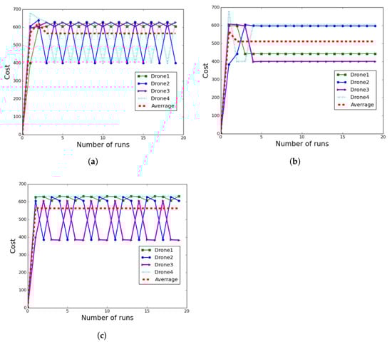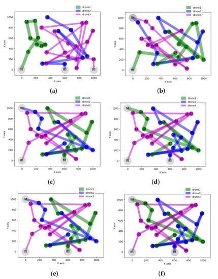 Figure 17a shows that paths keep on changing and non-visited nodes remain the same as the previous visitation. Note that Figure 17b is exactly the same as Figure 17a. This shows that all the following paths will be the same as Figure 17a and hence paths generation may converge to specific paths. This is a special case where the UAVs’ initial positions become the same as their optimal destination.