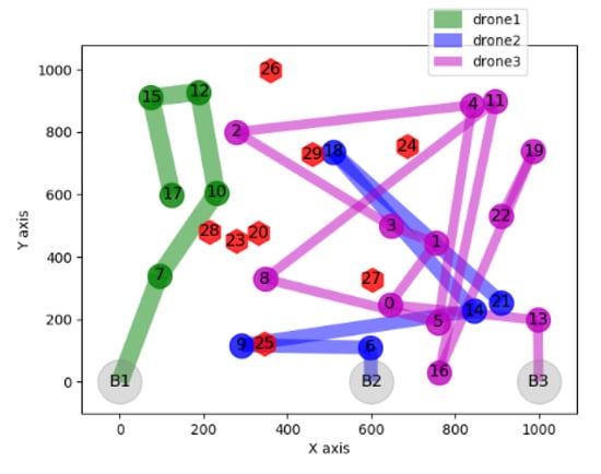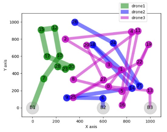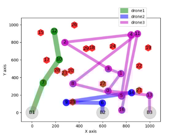 Compared with the previous two cases, Table 7 shows that the delivery paths keep on changing. Figure 12 shows that all nodes have been visited and the path of each drone has been extended to cover more nodes.
