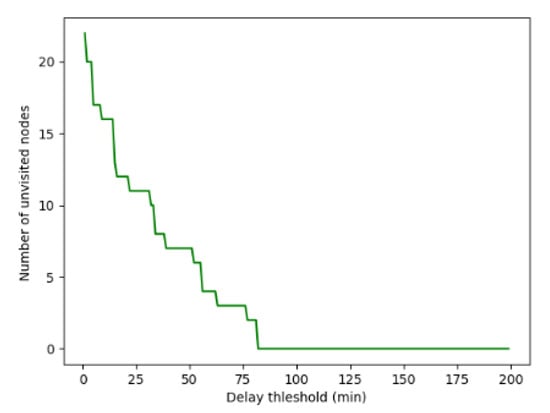 Variation of the number of unvisited nodes with respect to the delay threshold.