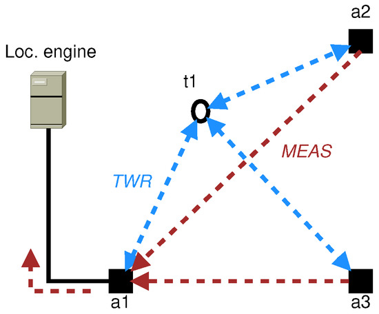 UWB-based IPS typically relies on a set of fixed-position anchors that exchange UWB frames with mobile tags. Typical protocols are two-way ranging (TWR) or time difference of arrival (TDoA). In the former, an estimate of the distance (range) between nodes is obtained, based on measuring the propagation time, while in the latter, the time of arrival of a beacon signal transmitted by the mobile tag is measured on different anchors that are time-synchronized. Whatever the approach, anchor measurements are then transferred to a location engine which has more computational resources to apply a trilateration algorithm, or to solve a system of hyperbolic equations to estimate the positions of the mobile tags. To transfer the measurements, most existing UWB-based systems rely on a separate backbone network. For example, LocURa [13] collects measurements using a serial/UART link and then transmits them over an Ethernet network. A similar approach was used by Macoir et al. [14] where the different cells of the network were connected through multiple Ethernet segments. Using another wireless technology, such as Wi-Fi or LoRa as a backbone in addition to UWB, has also been demonstrated [15,16].