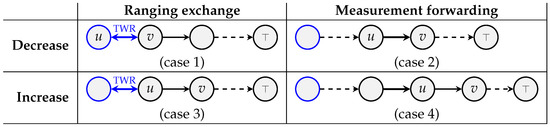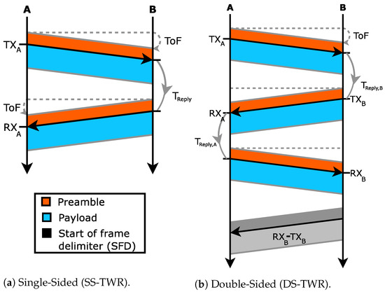 Variants of TWR can be used to reduce systematic errors. For example, differences in clock frequency between u and v could induce a small difference in the value of used by u and v. The double-sided two-way ranging (DS-TWR) illustrated in Figure 2b reduces such errors by averaging ToF measurements performed in both directions. Asymmetric double-sided two-way ranging (ADS-TWR) [19] is an improvement of the double-sided two-way ranging that allows the use of different predefined intervals , on each node, which allows transmission as soon as possible.