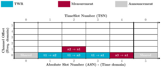 Figure 3 presents a possible schedule for the example given in Figure 1. There are five communications to schedule: three two-way ranging exchanges (in blue) between the mobile tag t1 and each anchor (a1 to a3) and two forwarding transmissions of ranging results (in red) towards the sink of the network, a1. In addition to this, a shared timeslot (in gray) is scheduled to announce the network and keep it synchronized. Two concurrent communications are scheduled at different channel offsets in the timeslot with TSN = 2.