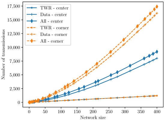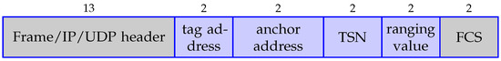The length of IEEE 802.15.4 MAC protocol data unit (MPDU) is limited to 127 bytes [51]. The above message structure requires 13 bytes for the various headers (frame, 6LoWPAN, IP, UDP), 2 bytes for the trailer (frame check sequence, FCS) and 8 bytes per ranging measurement.
