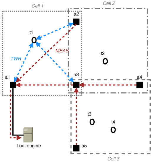 Example. Figure 7 shows an example positioning system composed of three cells, five anchors and four reserved tags. Each reserved tag performs ranging exchanges with its three assigned anchors. Some anchors communicate with reserved tags belonging to different cells (e.g., a3 is involved in the ranging of all the reserved tags). In addition to this, concurrent communications are possible in this system. For example, the following ranging exchanges can happen at the same time on different channels , and .