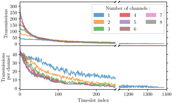 To perform channel hopping and make communications more robust to interference, the physical channel used by a TSCH cell varies from slotframe to slotframe, as dictated by Equation (2). The channel offset and ASN are mapped to a physical channel/code by means of a lookup table F. In the IEEE 802.15.4 time-slotted channel-hopping (TSCH) MAC layer for 2.4 GHz PHY, the lookup table is a pseudo-random permutation of the channels, generated using a linear feedback shift register (LFSR). In our implementation, the main objective of TSCH is not to be robust to interference but to increase the channel usage by means of frequency multiplexing. Therefore, in our case, F is just a lookup table of channels. Table 1 provides the list of channels used in our experiments, with . The table only contains channels that are 499.2 MHz wide. When two channels use the same frequency (e.g., channels 0 and 4), they use different orthogonal preamble codes and different values of the pulse repetition frequency (PRF), meaning that they can be used concurrently [17,20].
