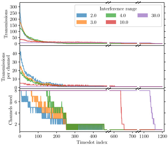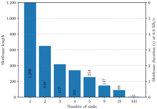 One can also observe that there is no benefit from aggregation when every anchor is a sink, since all messages go directly to a sink. The slotframe length in that case contains only five timeslots. Since there are 441 sinks for 1200 ranging measurements (3 ranging for 400 tags), the average number of communications required per sink should be less than three. The reason the slotframe length is five is that LSA is unable to schedule all these communications in only three timeslots due to some interference conflicts.