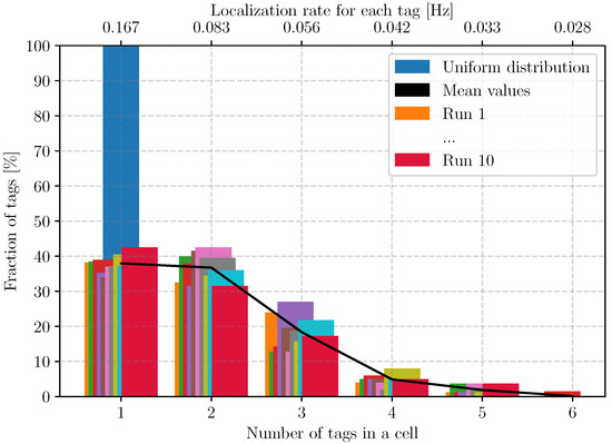 Each cell is responsible for performing ranging measurements for local tags. To allow anchors in a cell to be aware of which tags are present, tags need to register with the cell (through one of its anchors). The number of tags within a cell can change with time as the tags are allowed to move freely. We want to avoid changing the schedule of UWB-TSCH communications each time a tag registers with a cell or leaves it. For this reason, our approach consists of provisioning each cell with a predefined number of ranging timeslots to accommodate the expected number of tags the cell would need to support. We denote such provisioned nodes by reserved tags. The estimation of the number of reserved tags of each cell would be performed prior to the network deployment and could be updated during its lifetime, for example once per day or per hour. The timescale for re-scheduling is an open research question that we address in our evaluation. At shorter timescales, the actual number of tags present in a cell might differ from the number of reserved tags. Ranging the tags associated to a cell is performed on a round-robin basis. When a cell contains more tags than reserved tags, the ranging rate decreases. Correspondingly, when fewer tags are present, ranging can be performed more frequently than initially planned. Our approach thus trades-off signalling and scheduling load for accurate localization rate.