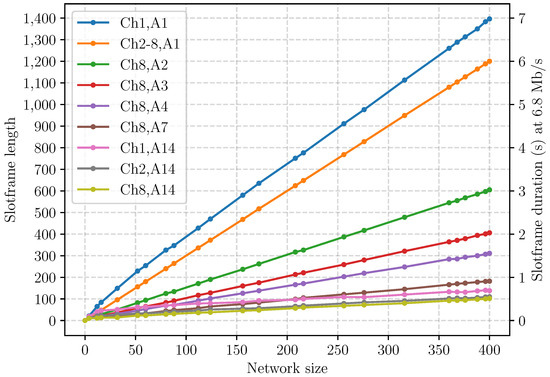 Figure 32 shows the relation between the network size and the mean computation time for several scenarios. Each scenario is noted Am,Sn where m is the aggregation level and n the number of sinks. The latter is either one sink (S1) or all sinks (SAll). Of all the experiments, the scheduling with one sink and no aggregation (A1,S1) takes the longest time, slightly more than 10 s. This was expected, as it requires the highest number of transmissions and leads to the longest slotframe. Recall that the number of iterations of the outer loop of LSA is directly related to the slotframe length as each iteration adds one timeslot.