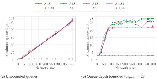 In Section 6, we mentioned that, under some scenarios, during the forwarding of measurements to the sink, the queue depth of some nodes can grow up to large numbers of messages. To account for the limited memory resources of constrained devices, we propose to bound the depth of these queues. Let us define as the maximum number of measurements that a node can contain, that is , . The value of this limit depends on the device resources and the requirements of the application and the real-time operating system (RTOS) in terms of memory.