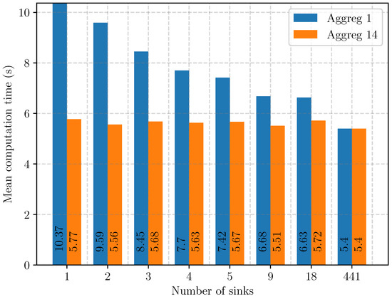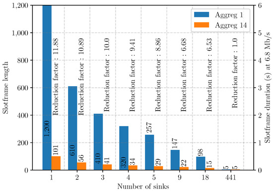 Slotframe length as a function of the number of sinks with either no aggregation (nagg = 1) or maximal aggregation level (nagg = 14). The network contains 400 cells and the schedule can make use of up to 8 channels.