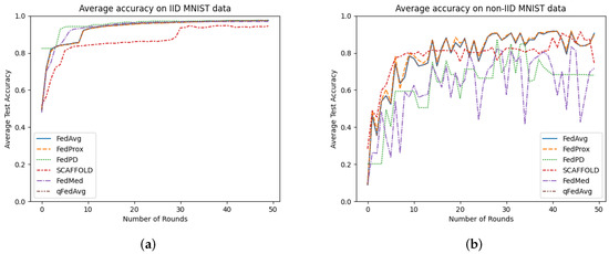 Average accuracy of FL algorithms over (a) IID and (b) non-IID data distribution for MNIST data set.
