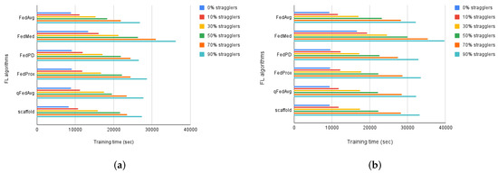 Training time of FL algorithms over (a) IID and (b) non-IID MNIST data for varying levels of stragglers.
