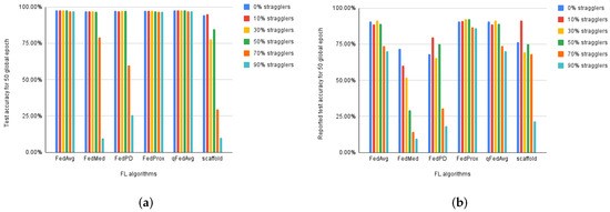 Average accuracy of FL algorithms over (a) IID and (b) non-IID MNIST data for varying level of stragglers.