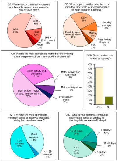 A qualitative description of responses to Q7–Q12 are depicted in Figure 2. The percentages are shown by total number of respondents per question, rather than the total number of survey respondents. In brief, a 66% majority of respondents (21/32) preferred devices which are worn on the wrist for sleep measurement (Q8) and a 49% majority of respondents (16/33) considered epoch-by-epoch/minute-by-minute to be the most important time scale for measuring sleep (Q8). On Q9, 52% (15/29) believed that the most appropriate method for determining sleep onset/offset was through a combination of brain activity, motor activity (e.g., activity counts), and peripheral biometric measures (e.g., heart rate and/or oxygen saturation). Eighty-three percent (83%; 24/29) of respondents indicated that they collected data related to napping or sleep fragmentation (Q10). Only these 24 respondents were permitted to answer Q11. On Q11, 52% (12/23) indicated that the most appropriate minimum period of inactivity that could be considered a nap was less than or equal to 20 min. Another sizeable fraction (44%) of respondents selected a time period of between 20 and 40 min. No respondents selected a time period greater than 60 min for Q11. For Q12, a 44% majority of respondents (14/32) preferred a continuous observation window of between 4 and 14 days long.