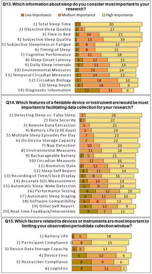 Rank order responses are depicted in Figure 3. For Q13, total sleep time (TST) received the highest ranking for information about sleep that respondents considered important to their research, followed by objective sleep quality, time in bed (TIB), and subjective sleep quality. Measures of sleep architecture or sleep depth and diagnostic information (e.g., apnea-hypoxia index, AHI) were ranked the lowest out of the provided categories. One respondent provided a write-in response indicating that social activity timing was of high importance to their research. Regarding device features which facilitated data collection (Q14), the ability to differentiate between actual sleep and “false sleep” (i.e., a period of low activity that mimics sleep onset but is not a sleep episode) was most frequently ranked as having high importance, followed by data security. The ability for subjects to self-report information other than sleep and the capacity to provide feedback or an intervention were ranked the lowest. For Q15, the top-ranked factor which respondents felt limited their observation period or window of data collection was battery life. Logistics, such as receiving approval for study procedures, was ranked the lowest. Four (4) respondents provided additional comments about the use of CSTs for research. The end-of-survey comments are included in Appendix A.