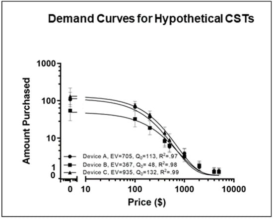 Demand curves were created for the hypothetical devices described in Table 2. The demand curves are depicted in Figure 4. The Gilroy et al. (2021) model of demand [33] fit the data well, with an average R2 of 0.9847. Post hoc extra sum of squares F-tests determined a significant difference between the curves for the three devices (F (2, 447) = 6.01, p = 0.003). Further examination showed that Device B had a significantly lower Q0 than Devices A and C, indicating that when the devices are free, participants would ‘purchase’ fewer units of Device B than Devices A and C. Additionally, the F-tests on α values indicated that the demand for Device B was significantly more elastic than the demand for Devices A and C. The essential values for Devices A, B, and C were 705, 367, and 935, respectively. In rank order, Device C maintained the highest purchasing level across prices, while Device B maintained the lowest.