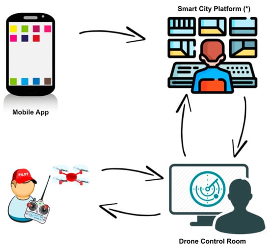 The main parts of the proposed system: the mobile application, the smart city platform which includes the application server (back end) and the web front end, and the system to plan and manage the inspections made by a drone. * Image from flaticon.com, accessed on 7 July 2022.