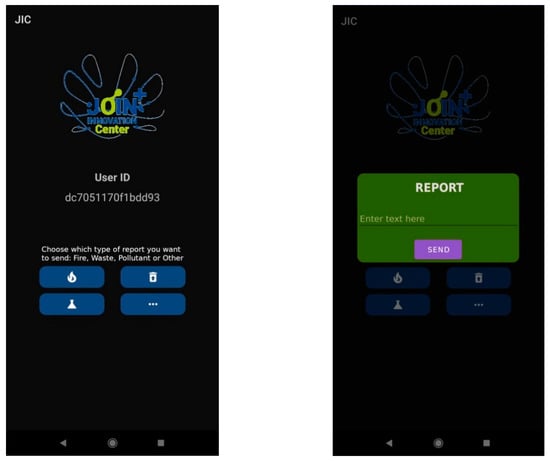 Each alert message is in JSON format and also includes the geographical coordinates of the mobile phone, along with the timestamp, and two unique identification strings: one related to the device (“id”), and the other to the alert itself. An example of alert type ‘waste’, in JSON format, is as follows: