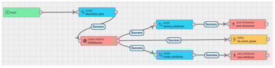 In the specific scenario linked to drones, the platform’s back end receives the stream of alerts sent by means of the mobile application, through a rule chain implemented with the open source IoT platform ThingsBoard [23] and shown in Figure 3. The approach used was to manage information and communications as if they were data generated by IoT sensors, and design the flow with a dedicated IoT platform to exploit their versatility and robustness.