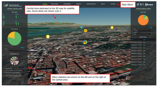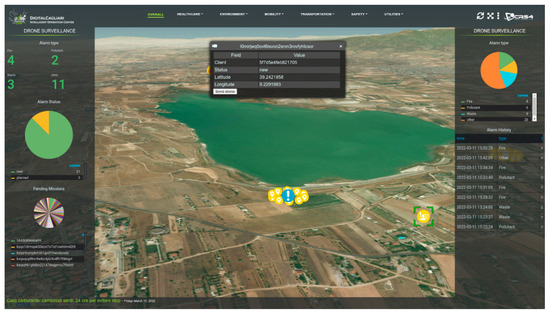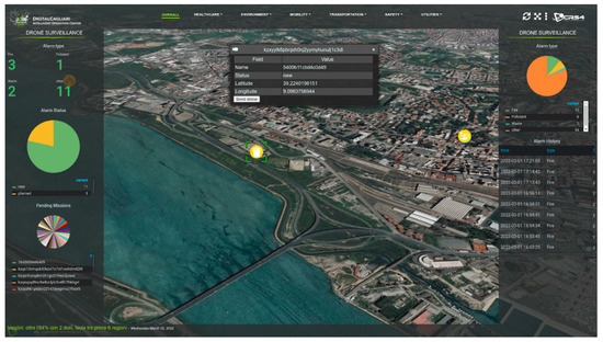Whenever a message is sent through the mobile application, it is received by the Smart City platform, which works as control room, showing all the alerts in the 3D satellite view. A proper algorithm for decision-making has not been developed yet, but from the overall view, shown in Figure 4, the decision-maker is supported in the careful analysis of all the messages received in order to single out the most dangerous ones that call for an inspection by drone. In order to do this, he/she simply has to select the alert shown in the view, which opens the related widget (also called, ‘infobox’); the widgets of all the new alerts have an extra button to activate the request for a drone flight. On the map, the alerts are shown in different colors, according to their status. Four progress statuses are possible: