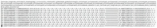 The generated CSV file must be downloaded and imported on the ‘‘Litchi’’ platform [25], a third-party software that allows mission planning and which integrates with most of the drones on the market. In the CSV file, the coordinates of the points defining the drone’s mission are listed; an example of a CSV file is shown in Figure 6.