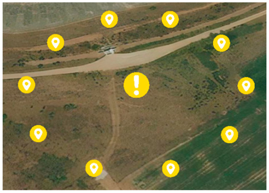 After loading the CSV file on the platform, the mission, the point of interest, and the related waypoints configured around the target, will be displayed on a georeferenced map of Litchi and then made available on any device connected to the platform, as shown in Figure 7.
