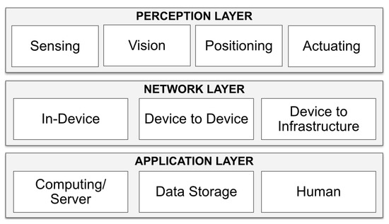 | Network [23,25,99] | In-device | DICOM, Bluetooth, WiFi, Zigbee, RFID, wireless sensor networks, NFC (Near-Field Communication), Z-wave, MQTT, LoRa and ultra-wide bandwidth (UWB), wireless body area networks (WBAN) | Transmitted perception data |