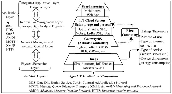 To precisely model and design an Agri-IoT network of desired expectations (refer to Figure 2) using the proposed architectural layers shown in Figure 5, the knowledge of the principal components and technologies used in each of these layers and how they interact and adapt for their intended functions is imperative. As depicted in the middle of Figure 5, the Agri-IoT ecosystem is composed of the following core components/technologies: