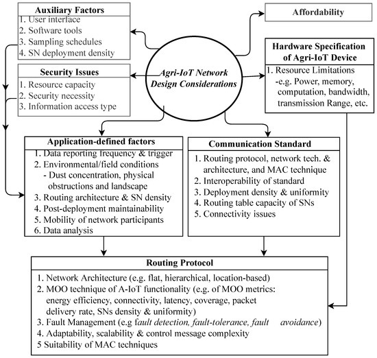 - Provision of reliable network architecture that supports energy-efficient routing, stable connectivity, self-adaptability, fault tolerance, operational simplicity/flexibility, platform independence, affordability, and location independence of Agri-IoT designs.