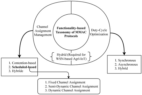 - Agri-IoT technology lacks comprehensive context-based synthesis from SN design to field deployment. The power- and resource-constrained SNs that form the WSN-based Agri-IoT network in the aforementioned context require limited data transmission rates, computational capabilities, memory capacities, communication distance, and operational stability. Consequently, the associated routing protocol [9,12,17,21], communication technology, and routing architecture [22,23,24] must support mechanisms that ensure packet size and communication distance moderation [16], efficient channel access management (CAM), and SN’s tasks management. It is not a mere application of conventional IoT to a farm, as many authors attempted [1,10,11,12,17,18,19,20,23,25,26], which lacked application-specific requirements such as dense network inter-connectivity, higher information perceptibility, comprehensive intelligence services, remote monitoring, smart decision making, and the execution of precise control/actuation actions on the farm.