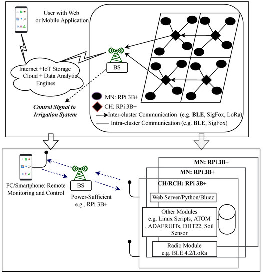 - Gateway (BS): The BS interfaces the WSN out in the field and the applications situated in the cloud servers. This unit aligns with the network management and actuator control layer shown in the middle of Figure 5. The WSN sublayer may have more than one BS(s), each with the capacity to handle most resource-demanding computational tasks besides actuation execution, network construction, scheduling of event sampling, and network supervision services. They may also allow bidirectional communication with the cloud/user and WSN. Similar to standalone IoT devices, the BS can be equipped with 4G/5G/LTE/NB-IoT, cellular-based, Wi-Fi, LoRaWAN, or wired ethernet communication technologies to interact with the cloud, and low-power communication standards such as LoRa, low-power Wi-Fi, SIGFOX, UMTS, BLE, and Zigbee (Figure 5) to communicate with the sensor field. However, Agri-IoT networks require that both upper-layer and lower-layer communication technologies of the BS should be low-power, freely available, easy to deploy and manage, and platform-independent. The BS may preprocess or relay the raw data to the cloud for remote data processing. The BS(s) locations are strategically chosen to optimize network communication costs.