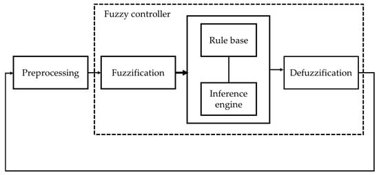 Figure 4 depicts the conventional layout of a fuzzy logic controller. Before going into the main control block, the inputs which were crisp values produced by the feedback error and change in error were conditioned by multiplying by constant gains using a preprocessor. The fuzzification block matches data with criteria of rules and transforms input data into degrees of membership functions. The Mamdani-type inference engine took the rule-based commands as input, calculated the degree of capability of the used rules, and produced a fuzzy set for the defuzzification block, which took the fuzzy output data and produced crisp values. Through the use of the centroid defuzzification approach, the outputs of the fuzzy sets were transformed into crisp values [,].