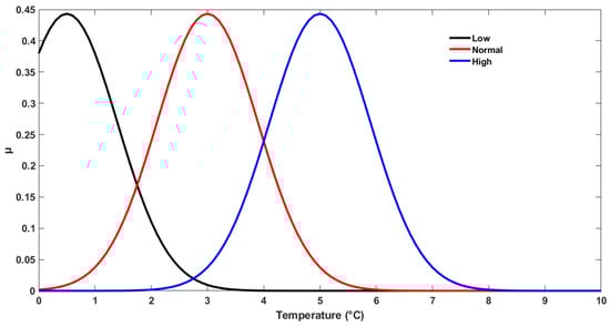 The membership assignment for temperature is displayed in Figure 5. Temperature regulation would be based on function. Low is represented in black, normal is presented in red, and high is represented by blue, which have been assigned to the values. The Gaussian function is used to represent the function. While probability was represented by the vertical axis, the horizontal axis was expressed in degrees Celsius.