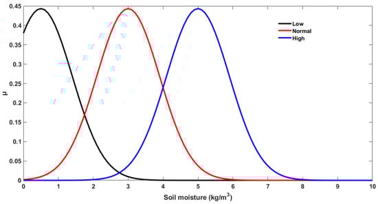 The membership assignment for humidity is displayed in Figure 7. The foundation for regulating soil moisture would be function. Three values have been assigned to the values: low, which is represented in black, normal, which is presented in red, and high, which is represented by blue. The Gaussian function is used to represent the function. The vertical axis represented probability, and the horizontal axis was expressed in mass per cubic meter.