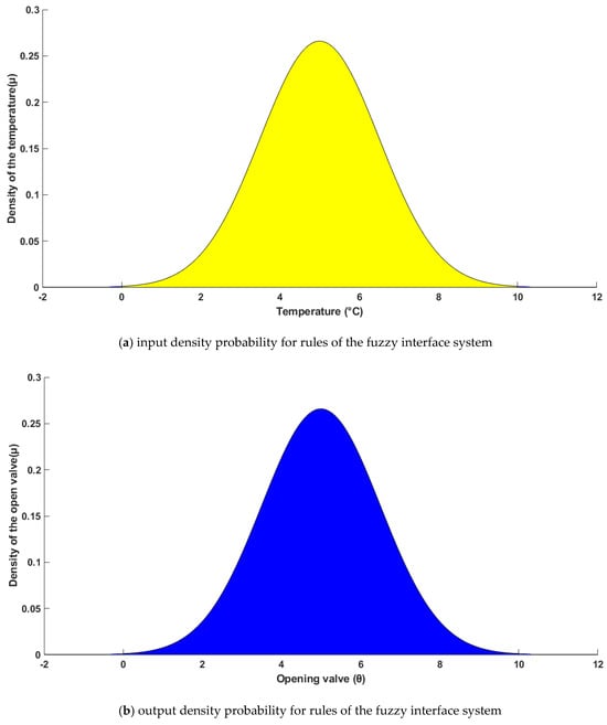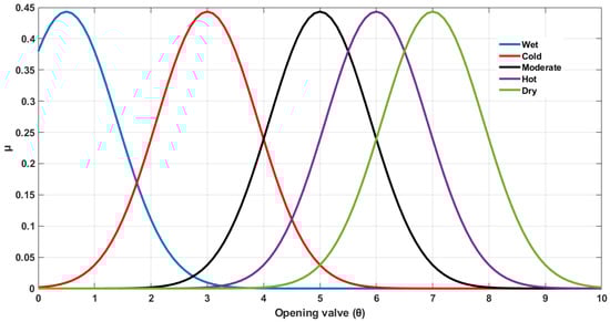 Figure 8 shows the membership assignment for opening the valve. Function would be the cornerstone for controlling the valve’s opening. Wet is represented by blue, cold is shown in red, moderate is presented in black, hot is demonstrated in purple, and dry is presented in green. The function is represented by the Gaussian function. Probability was represented by the vertical axis, while degrees were shown by the horizontal axis.