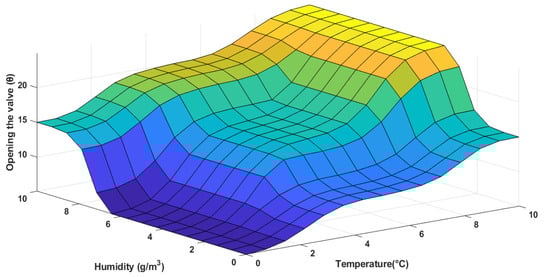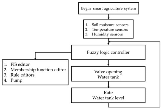 Many researchers have spent their time on the application of IoT devices in agriculture without considering the application of different controllers in agriculture to date. Furthermore, to sustain the health of the farm and maintain mass productivity, it is necessary to implement intelligent controller algorithms such as fuzzy logic, adaptive, model predictive, and so on into an agriculture system in order to enhancement the communication between faming system. The nature of agriculture structure requires flexibility, ease of implementation, robustness, and interpretability. Among the intelligent controllers, a fuzzy logic controller is the best fit to address the nature of agriculture structure requirements. The reason is that it works with imprecise inputs, does not require an accurate mathematical model, and can handle nonlinearity. It enables advanced fuzzy logic to control a pump’s switching time according to user-defined variables, whereby sensors are the main aspect of and contributor to the system []. It introduces an innovative irrigation time control system for smart farming that leverages fuzzy logic to regulate the timing of irrigation in crop fields, effectively curbing water wastage while ensuring that crops receive neither too little nor too much water. A smart greenhouse system based on an IoT and fuzzy inference system can create an automatic microclimatic condition that optimizes the conditions of plant growth through the use of IoT sensors and actuators that automate the controlling of weather factors to enhance the plant growing process. A smart farm system can optimize water usage for agriculture. The system implements an open loop fuzzy logic control system using a Mamdani control system. The inputs to the fuzzy logic control system are adapted from a humidity sensor, temperature sensor, and the flux sensor in the field [,].