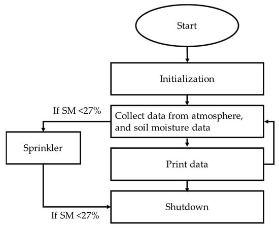 Figure 12 shows the working principles of the IoT implementation in the agriculture system. The system starts up and initializes, then collects data from the agricultural fields. It then prints whether the soil moisture (SM) is less than 27%, in which case the sprinkler turns on, or if the soil moisture (SM) is greater than 27%, in which case the sprinkler turns off.