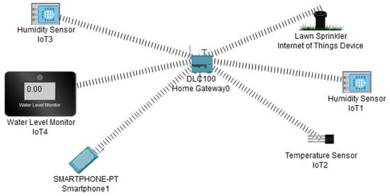 After the controller design was finished, it was implemented in Cisco Packet Tracer with integrated MATLAB/SIMULINK environments. Figure 18 shows the real-time flow of data packets during the simulation. The fuzzy logic intelligent controller is the home gate connected to the IoT backend server. The IoT connection enables users to check the status of the IoT parameters such as temperature, humidity, and soil moisture from an IoT browser homepage. The IoT browser homepage shows a list of the smart devices, allows visualization of their status, and permits remote interaction with the devices. Logical interaction between smart devices can be set while connected to the IoT main homepage. Interactions between devices are based on set conditions, such as starting a chiller when the temperature of a particular unit needs to be lowered or reducing oxygen supply to a boiler in order to reduce fire tube temperatures. The central control PC, manager smartphones, and tablets, which are connected to the local central office wireless LAN (WLAN), can connect to the dedicated IoT homepage via a browser in order to monitor all connected IoT devices. Cisco Packet Tracer has a feature with the possibility to switch from real-time to simulation mode. The first mode enables the possibility to create the underlying network, connect IoT devices, and define IoT backend logic. However, only in the simulation mode, it was possible to validate that the network communication layer really happened between the devices. In the simulation mode, it was possible to simulate packet traffic between nodes and devices in order to check the connectivity, routing protocols, and other network logic. This mode helped to physically visualize and troubleshoot any kind of network, for example, setting up pings or more complex packages between nodes.
