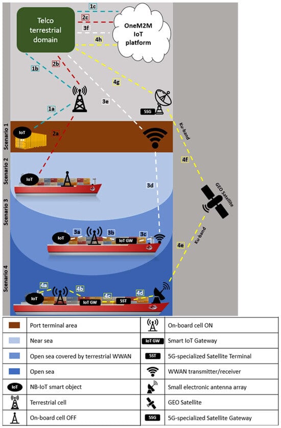 The 5GT System comprises an NB-IoT framework on top of a hybrid terrestrial–satellite network, providing information coming from the cargo-ship scenario (maritime domain) and port terminals (terrestrial domain) to a oneM2M IoT cloud platform, making it available to the customers’ application (see Figure 1).