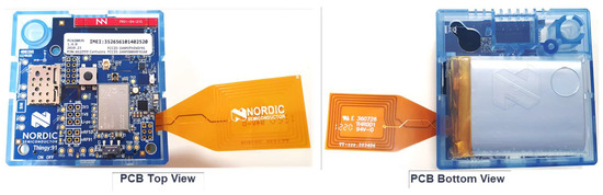 From this initial analysis, it was found that both approaches are feasible, in principle, although each has advantages and disadvantages. In general, Nordic is less power-demanding but more expensive, whereas ESP32 + Quectel is cheaper but more power-demanding. Then, the devices for both approaches were purchased (see Figure 5 and Figure 6) and preliminary tests were performed: (1) set up the NB-IoT communication; (2) set up BLE Mesh.