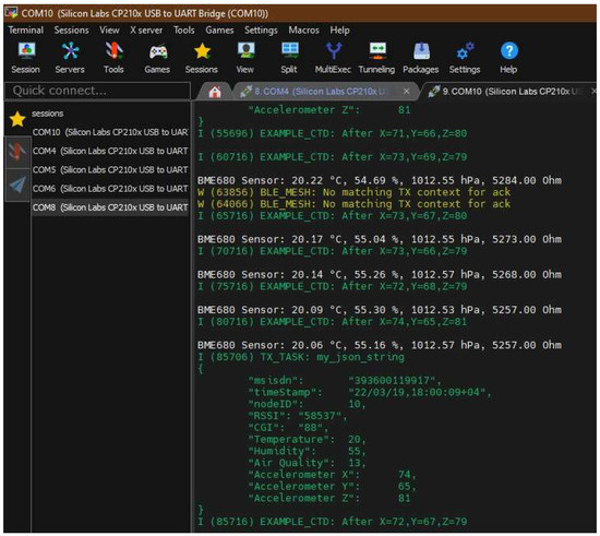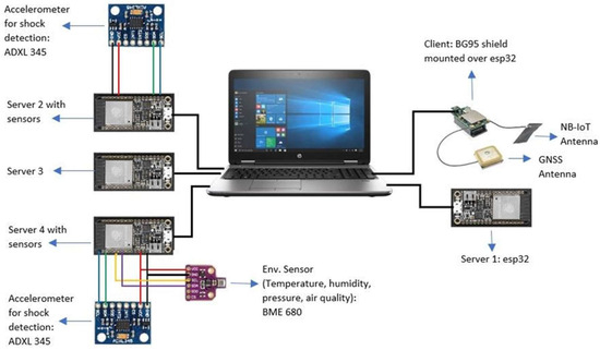 Ideally, all the ESP32 boards should have had a Quectel BG95 shield mounted on top of them, so that in the final CTD’s implementation, any one of them can send the data to the cloud if the cellular connectivity is available, but since the test goals are to verify the BLE Mesh capability, only one BG95 shield was used. It was only installed on the provisioner/gateway node (which in Figure 9 is called “client” so that once the mesh is provisioned, the BLE Mesh “client” node fetches the data from the BLE server nodes) that can send data to the cloud. Furthermore, each ESP32 board should be connected to BME680 and ADXL 345 sensors to measure environmental data and shock detection, respectively, of each individual container. Nevertheless, for the PoC implementation, only one BME 680 and only two ADXL 345 were available; therefore, only one of the BLE Mesh nodes (called servers in Figure 9) has BME 680 and ADXL 345, and one of the BLE Mesh nodes has just ADXL 345. Furthermore, in the PoC setup, the battery has not been used. The boards are powered using the USB ports of the laptop. Since the door sensor was not available, it has not been used in the PoC setup.
