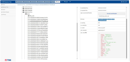 The test consisted of only one device integrating both the sensors: the GNSS and the NB-IoT module publishing data to the oneM2M platform on the cloud. Regarding Figure 9, the test was essentially conducted by equipping ‘Server 4’ with the BG95 shield and NB-IoT and GNSS antennas. The ICON oneM2M-compliant TIM cloud platform [37] was used to monitor the data in the cloud. Figure 10 shows the dashboard of the TIM ICON cloud services that are used for this project. Data in the cloud can be viewed by navigating to the resource tree and checking the data in the inbox corresponding to the MSISDN code of the SIM put into the device. Figure 11 shows the CTD’s data on the TIM ICON OneM2M compliant platform, hence verifying the NB-IoT connectivity, the sensors and the GNSS operation.