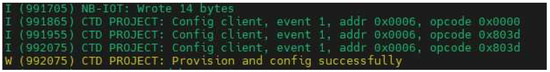 This section discusses the results of the tests described in Section 4, with a special focus on the power consumption of the CTD. After verifying that the firmware is capable of correctly handling the various functions of the device, namely NB-IoT transmission to the OneM2M-compliant platform for sensor data (Figure 10 and Figure 11), BLE Mesh network provisioning by the provisioner/client node (Figure 12 and Figure 13), and data transmission to the OneM2M-compliant platform, by the provisioner node in NB-IoT/BLE Mesh gateway mode (Figure 14 and Figure 15), specific current measurements were taken to size the battery pack.