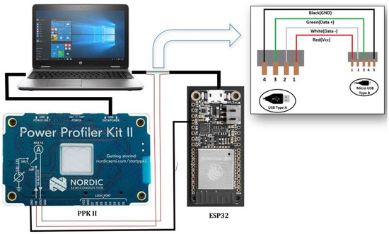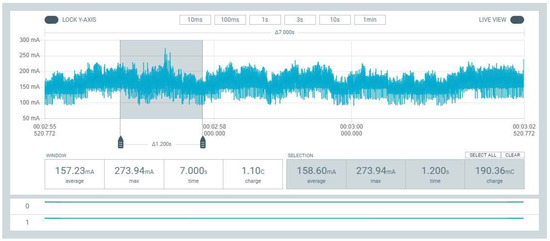 For current consumption measurement, the Nordic PPK2 module was used. For monitoring the measurements, the Power Profiler Kit App with nRF Connect for Desktop software (v3.4.3) was used. The practical setup is sketched in Figure 16.