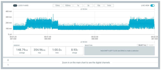 There are two modes in the application, i.e., Source Meter and Ampere Meter. In Source Meter mode, the PPK2 device acts as a battery source to power up the development board. In the Ampere Meter mode, the PPK2 device acts as an ammeter to measure the current. Since the goal of the task was to measure the current consumption, the Ampere Meter mode was used. In the application, the sampling rate can also be changed. It should be noted that more samples imply more accurate data but more consumption of resources. Since spending the resources was not an issue, the maximum sampling rate has been selected, i.e., 100 kSPS (kilo-Samples Per Second). Sampling time can also be changed in the application. Since the scenario for the prototype is that the CTD will transmit data for 5 min, 4 times a day, the sampling time is kept at approximately 5 min. This will only capture the power consumption in the active mode of the device, and from that, the behavior of the device can be estimated over one year.