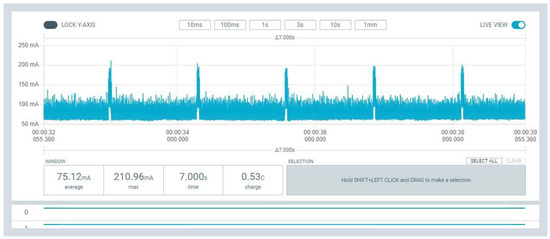 Figure 17 shows as an example the current measurement over one minute, for the gateway node with all interfaces active. During this period, two transmissions with NB-IoT and BLE Mesh occur, lasting about 15 s each. Figure 18 shows the current consumption when the ESP32 processor is running in active mode with the BLE radio turned on, transmitting periodic beacons. Figure 19 shows the current consumption when using the BLE Mesh radio channel to transmit sensor data.