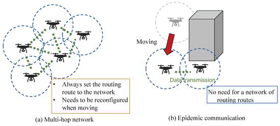 Therefore, we propose a specific application of epidemic communication for mobile devices such as robots and drones. Robots and drones have been rapidly adopted in various practical applications, and the control technologies for these devices have been standardized. For example, a robot operating system is an open-source robotics framework middleware that facilitates various R&D activities and practical applications to satisfy specific goals and requirements [21,22,23]. Robots and drones intended for deployment in disaster-stricken areas are designed to perform activities remotely, replace human labor, and collaborate with other robots and drones via information sharing. For example, drones are used for pollination tasks in agriculture and for transmitting data concerning instructions and flight control information [14,24,25]. In systems in which multiple robots or drones collaborate, accurate sharing of information among them is essential. In practical applications, related studies have utilized the sharing of environmental information between drones, as shown in Figure 1a. This shared information is then used for autonomous flight control. Additionally, the sharing of sensor data collected by robots has been employed to create maps [26,27,28]. In environments where the conditions for wireless communication are not ideal, epidemic communication allows nodes with information (wireless stations) to communicate autonomously and carry information by pas. Considering this background, we designed a wireless device to implement epidemic communication for drones and developed an epidemic communication system. We designed the system for practical use and considered the interference between wireless devices, the optimization of communication areas, and the amount of transmitted data.